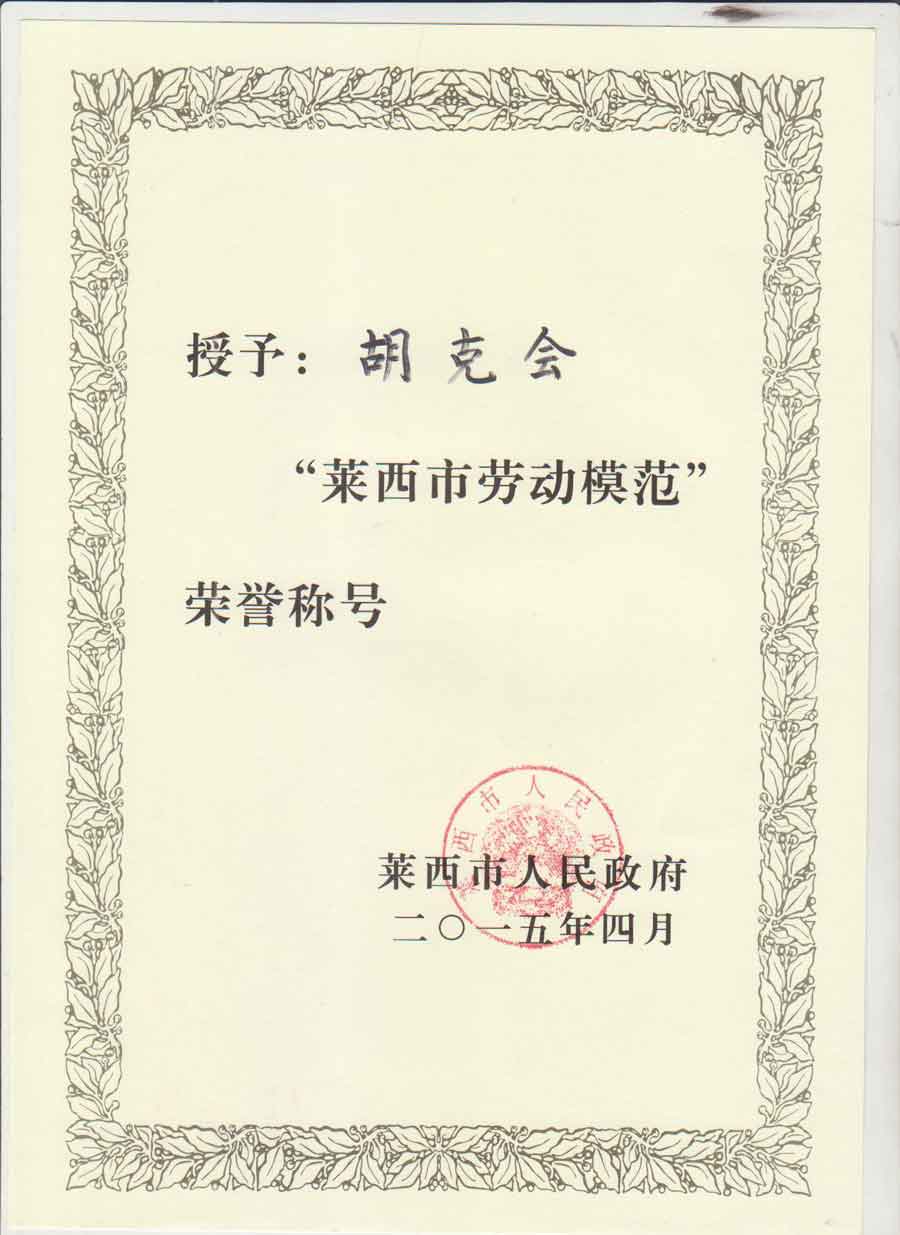 智慧云谷CEO胡克会荣获2012-2014年度莱西市劳动模范称号。