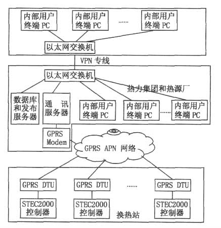 通讯网络承担工作站与各个现场控制站之间的数据传输, 数据交换, 是整个监控项目的桥梁, 是保证热网监测系统正常运行的关键,本系统采用GPRS无线通讯。