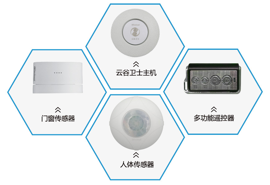 云谷卫士主要由云谷卫士主机、门窗传感器、人体传感器、多功能遥控器几个部分组成。