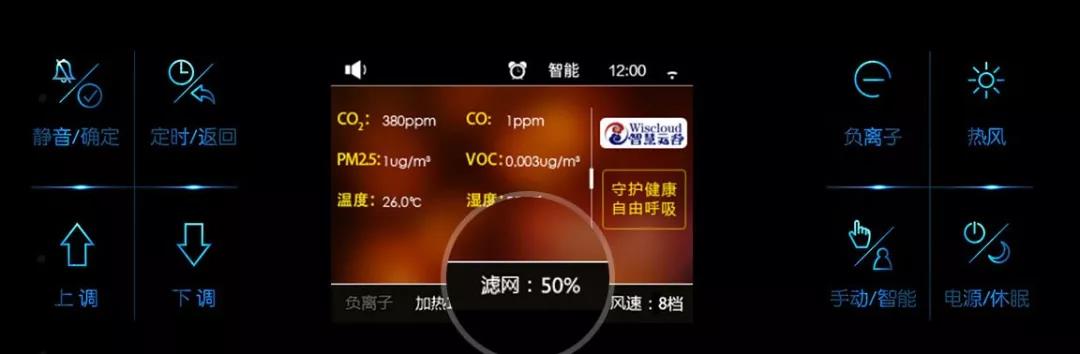 拥有特有负离子按钮,释放负氧离子,打造森林氧吧。打开负氧离子按钮,释放高达800万个/cm3负氧离子,使得带静电的烟、尘灰颗粒沉降,达到除尘、杀菌、消毒的作用,并且空气负氧离子含有镇静、催眠的作用,每天吸入适量的负氧离子,使人减轻疲劳,改善睡眠;减轻神经衰弱;使人精力旺盛,提高工作效率,降低疾病发病率,预防感冒和呼吸道疾病;改善心脑血管疾病的症状。