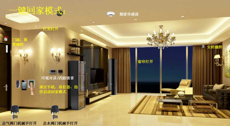 傍晚7:00回家,可以通过手机或者4键小遥控器或指纹一键“回家情景模式”。此时,家中的防盗报警撤防、门自动打开、门口灯、客厅灯依次打开、窗帘打开、饮水机开始工作、燃气与水阀门同时打开,一切呈现出欢迎主人回家的情景。