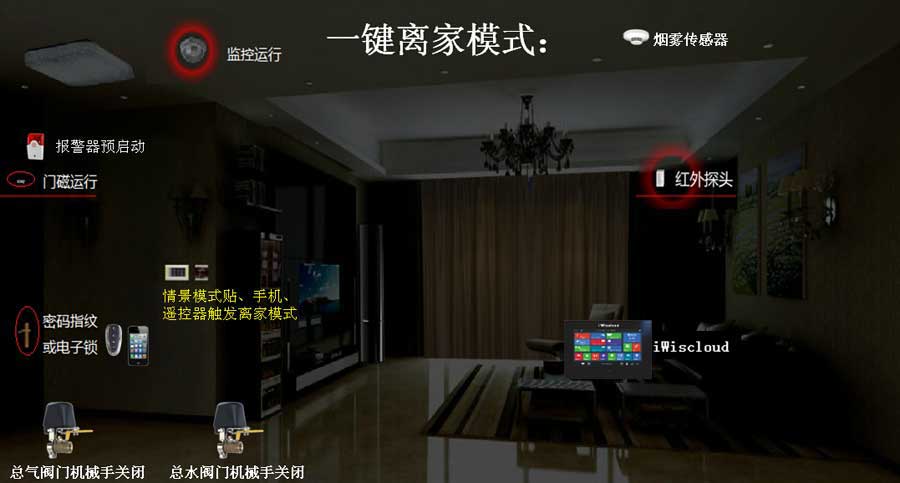 通过4键遥控器或门口的随意贴按下“离家模式”,窗帘缓缓关闭,室内所有用电器断电、断水、断气,门磁、窗磁、移动物体传感器、烟雾报警器等全部启用布防。
