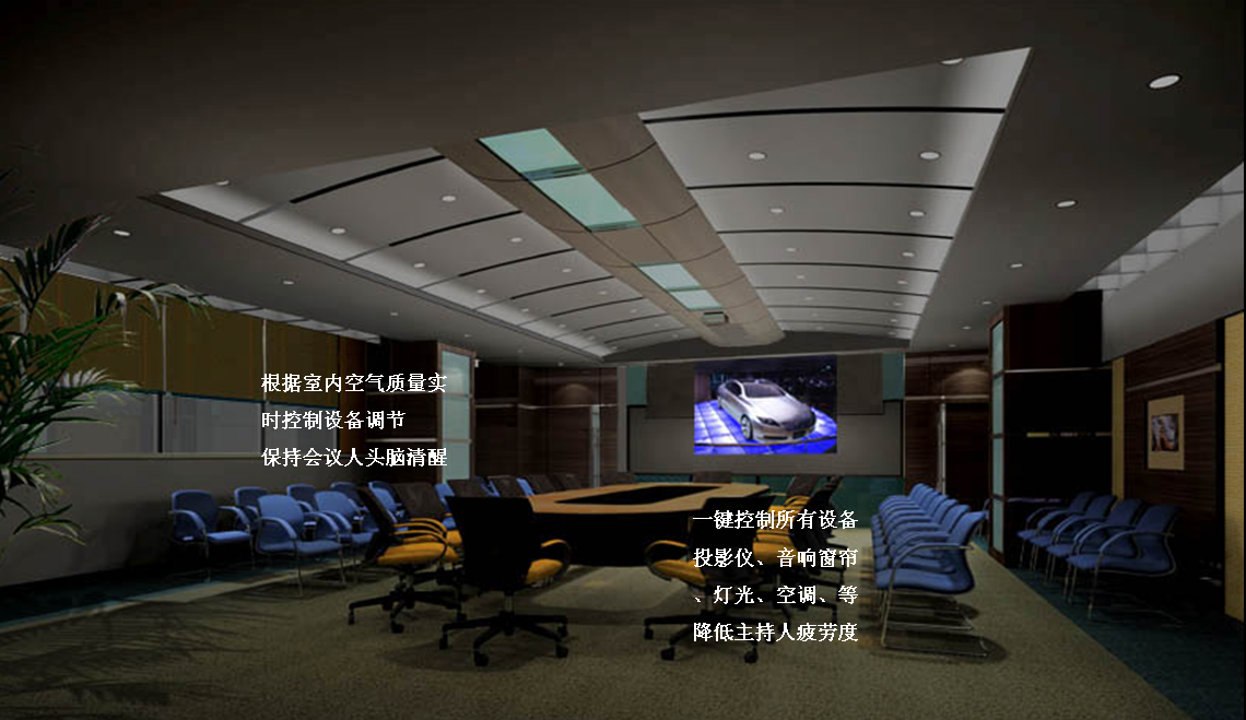 14:00会议室领导开会,触摸“会议模式”灯逐一亮起,窗帘拉开,背景音响系统打开,空调、加湿器、加氧机等根据空气监测数据启动